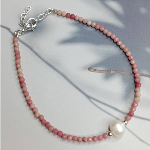 Pearl bracelet with deep pink beads and a single pearl accent on a silver clasp. Delicate everyday piece with a polished finish.