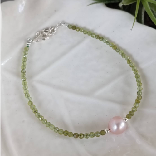 Pearl bracelet with soft green beads and a single pearl accent on a silver clasp. Delicate everyday piece with a fresh polished look.