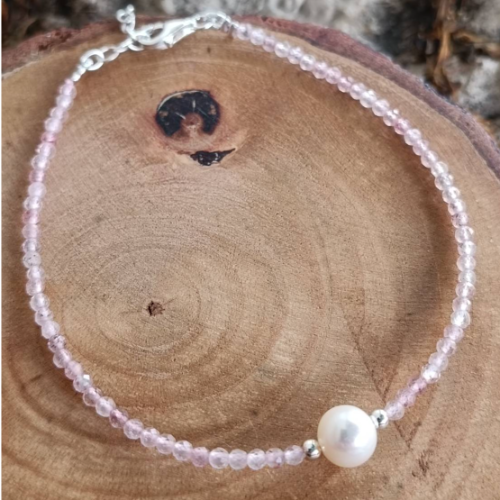 Pearl bracelet with pink beads and a single pearl accent on a silver clasp. Delicate everyday piece with a soft polished look.