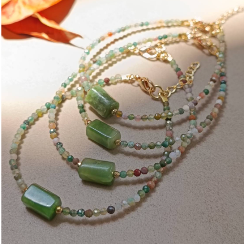 Natural stone bracelet with olive green stones and tiny gold charm accents. Lightweight handcrafted style with an earthy polished finish.