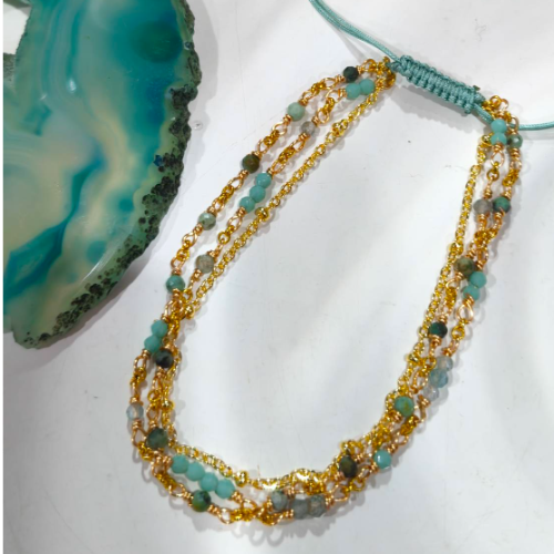 Adjustable natural stone bracelet with layered chains and mixed color stone and acrylic beads. Bright handcrafted style with a playful layered look.