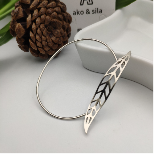 Alloy bracelet with an open leaf motif in a silver finish. Lightweight cuff style with a sleek modern look.