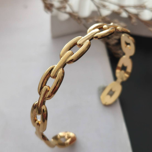 Stainless steel bracelet in a polished gold finish with elongated oval links. Clean chain style with a sleek modern finish.