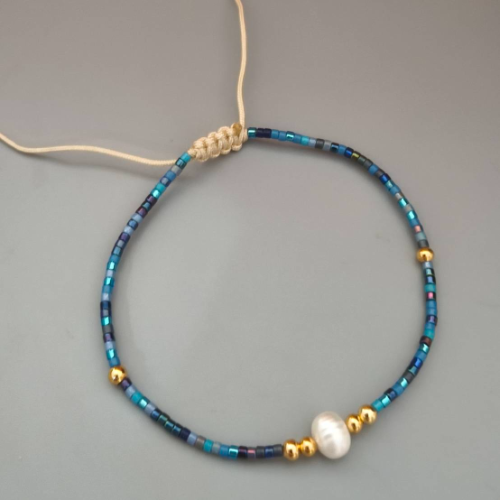 Adjustable layered pearl bracelet with fine gold chains and deep blue bead accents. Elegant handcrafted style with a vivid polished finish.