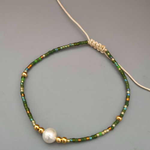 Adjustable layered pearl bracelet with fine gold chains and dark green bead accents. Rich handcrafted style with a balanced elegant look.