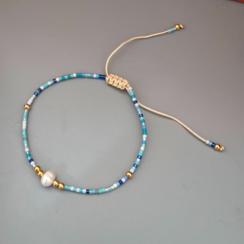 Adjustable layered pearl bracelet with fine gold chains and light blue bead accents. Fresh handcrafted style with a cool soft finish.