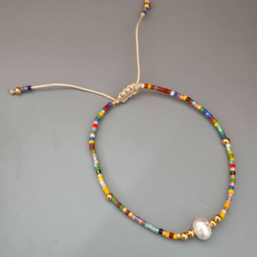 Adjustable layered pearl bracelet with fine gold chains and mixed color bead accents. Playful handcrafted design with an easy layered finish.