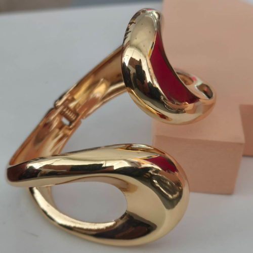 Stainless steel bracelet in a polished gold finish with a smooth wrapped silhouette. Bold metallic statement piece with a clean curved profile.