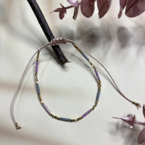 Perfect fit design acrylic beaded bracelet with deep purple bead accents on a fine cord band. Compact handcrafted style with a rich colorful look.