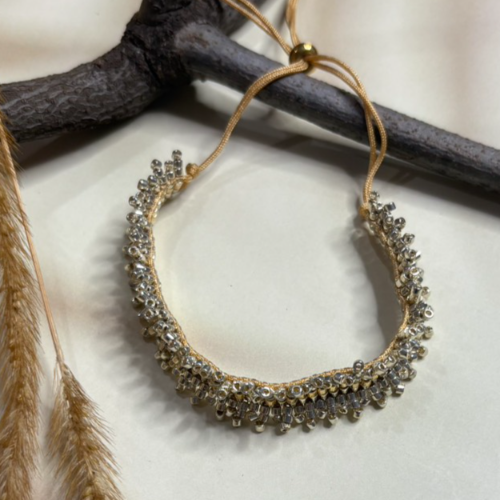 Open cuff style bracelet with grey bead detailing on a gold tone base. Textured statement design with a clean handcrafted look.