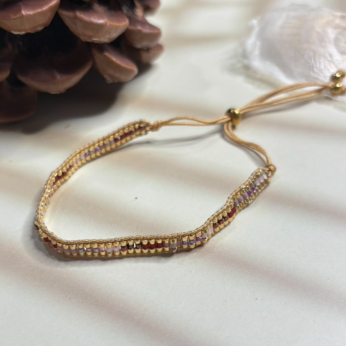 Adjustable bracelet with dark red bead rows bordered by gold tone detailing. Slim handcrafted band with a neat statement finish.