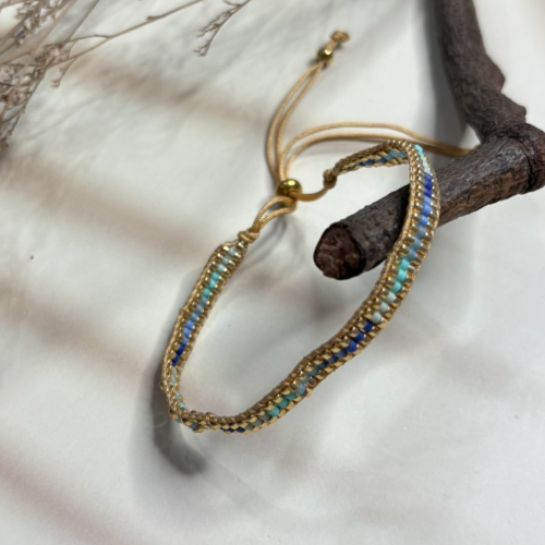 Adjustable bracelet with pink blue and white bead rows finished with gold tone accents. Lightweight handcrafted band with a fresh colorful feel.