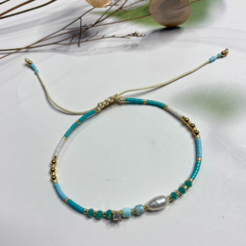 Adjustable pearl bracelet with turquoise beadwork and a central pearl accent on a slim cord band. Light handcrafted piece with a clean colorful look.