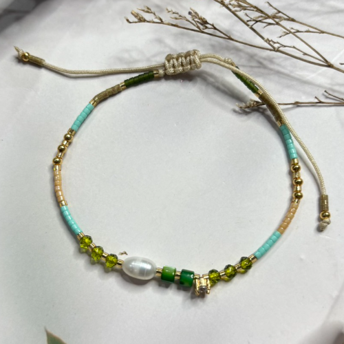 Adjustable pearl bracelet with green and blue bead accents paired with a central pearl detail. Fresh handcrafted design with a balanced multicolor look.