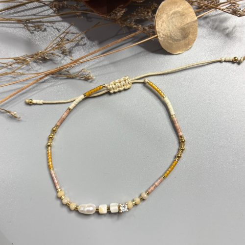 Adjustable pearl bracelet with white pearl beads and gold tone accents in a neat minimal design. Elegant handcrafted style for everyday or festive wear.