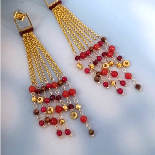 Natural stone earrings with fine gold chain tassels and red crystal accents. Statement pair with graceful movement and shine.