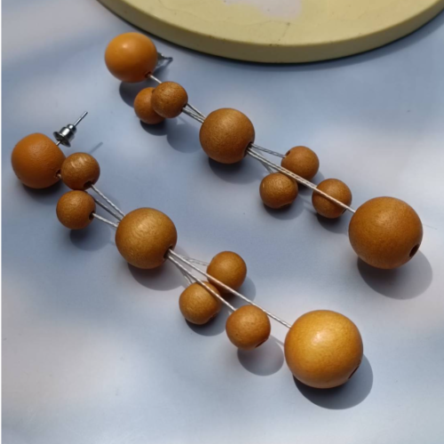 Wood drop earrings with polished brown ball details in a linear arrangement. Lightweight pair with warm earthy movement.
