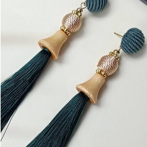 Cloth drop earrings with teal tassels and ribbed fabric studs. Lightweight statement pair with soft movement and a handcrafted finish.