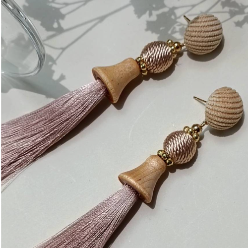 Cloth drop earrings with mauve tassels and ribbed fabric studs. Lightweight statement pair with soft movement and a handcrafted finish.
