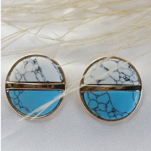 Natural stone stud earrings with white and turquoise marbled halves divided by gold bars. Clean geometric pair with a polished finish.