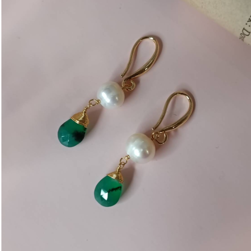 Pearl earrings with green teardrop beads and soft pearl accents. Lightweight pair with a fresh elegant look.