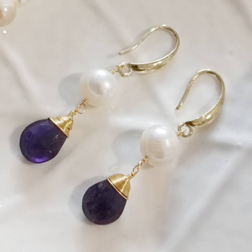 Pearl earrings with purple stone drops and soft pearl accents. Lightweight pair with a rich elegant finish.