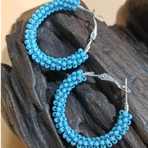 Beaded hoop earrings in bright light blue tones with a silver finish. Bold lightweight pair with a playful textured look.