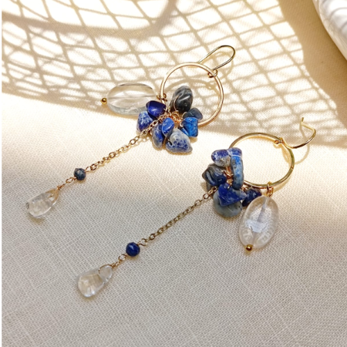 Natural stone and bead drop earrings with blue floral accents and slim dangling strands. Lightweight statement pair with handcrafted charm.