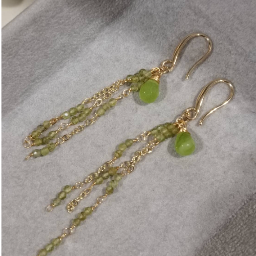 Natural stone earrings with green stone drops and fine chain tassels. Lightweight pair with graceful movement and shine.