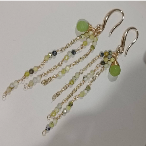 Natural stone earrings with cascading light green beaded strands and gold hooks. Lightweight pair with fluid movement and a handcrafted finish.