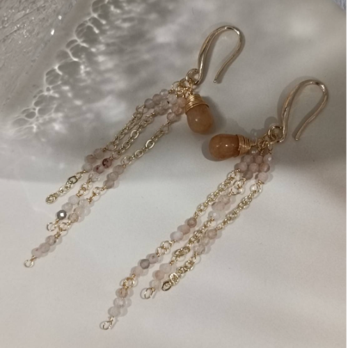 Natural stone earrings with cascading peach toned beaded strands and gold hooks. Lightweight pair with fluid movement and a handcrafted finish.