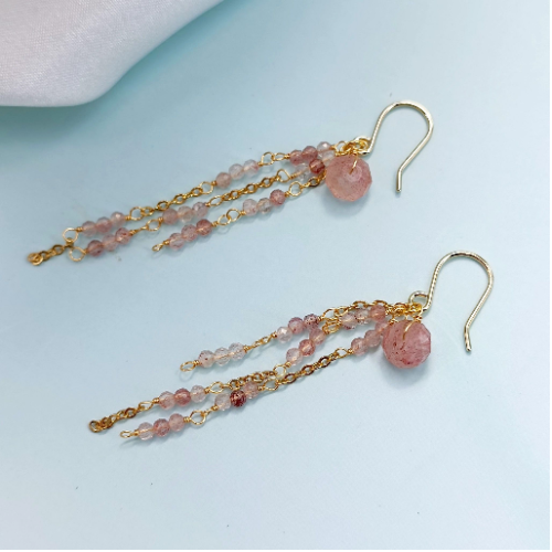Natural stone earrings with pink bead tassels and round pink stone tops. Lightweight pair with fluid movement and soft sparkle.