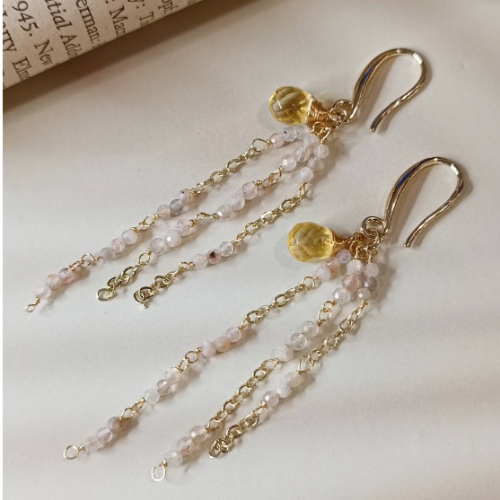 Natural stone earrings with cascading yellow toned beaded strands and gold hooks. Lightweight pair with fluid movement and a handcrafted finish.