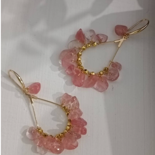 Natural stone hoop earrings with pink chip beads and gold tone wire. Lightweight statement pair with soft artisanal texture.