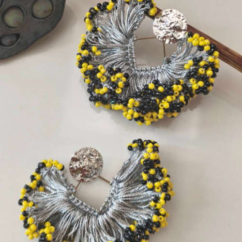 Nylon statement earrings with black and yellow borders Miyuki beaded and silver fringe. Bold, handcrafted, and eye-catching.