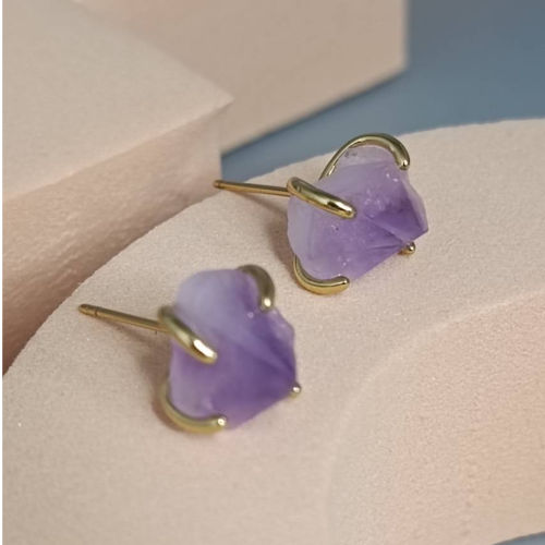 Amethyst Organic stone stud earrings in gold tone prong settings. Minimal everyday pair.