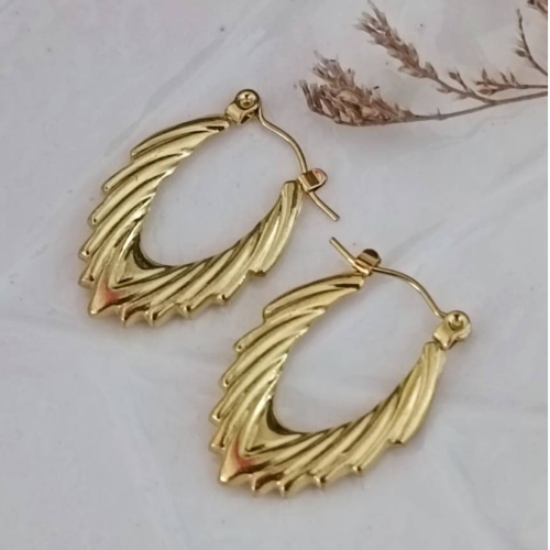 Alloy hoop earrings with polished gold tone fans and textured fringe details. Lightweight statement pair with an elegant sculptural finish.