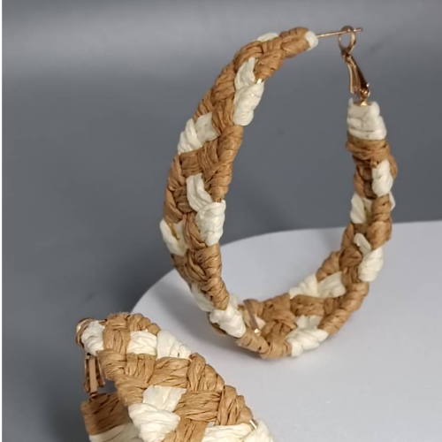 Paper hoop earrings with a thick woven natural fiber texture and rounded silhouette. Lightweight statement pair with an earthy handcrafted finish.