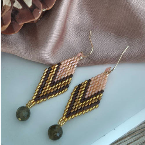 Green Tourmaline drop earrings featuring a diamond-shaped frame with layered gold and pink Miyuki beads. Featherlight artisan pair with Vitality, Growth, Healing, Prosperity.