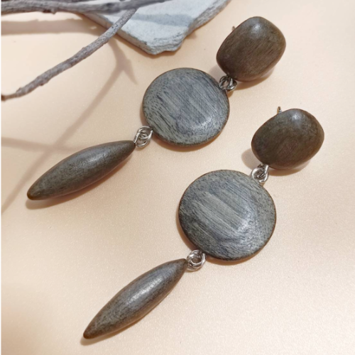Wood drop earrings with charcoal oval drops and grey round accents. Lightweight pair with soft earthy texture.