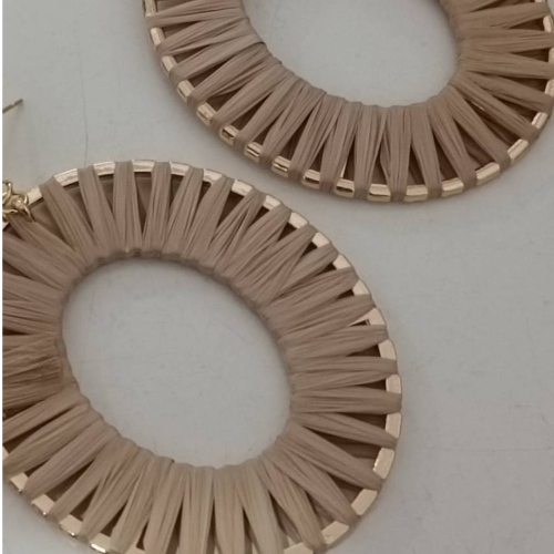 Hoop earrings with open circular shapes and stitched natural tan sunburst texture. Lightweight statement pair with an earthy handcrafted finish.