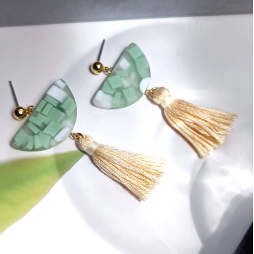 Acrylic drop earrings with sage marbled panels and soft cream tassels. Lightweight statement pair with a fresh artisan finish.