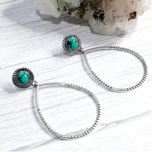 Natural stone drop earrings with turquoise studs and open silver teardrop frames. Lightweight statement pair with a clean modern look.