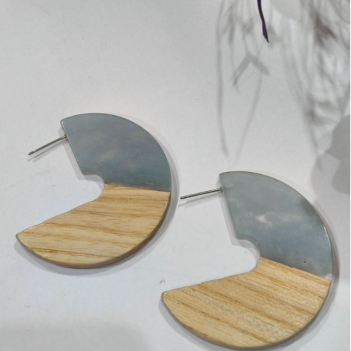 Acrylic earrings with slate blue crescent tops natural wood-look half moon bases and gold tone hooks. Lightweight statement pair with a modern earthy finish.