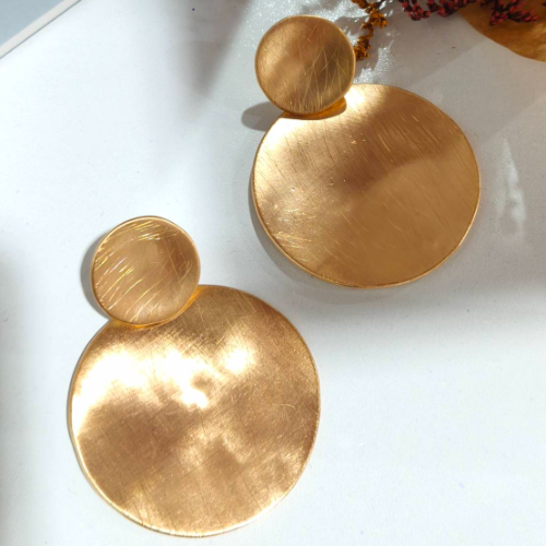 Alloy drop earrings in a brushed gold finish with layered round discs. Clean statement style with a modern polished look.