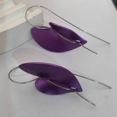 Aluminium drop earrings with purple marquise forms on stainless steel hooks. Lightweight statement pair with a smooth modern look.
