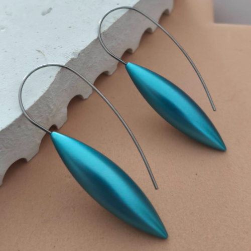 Aluminium drop earrings with slim blue leaf shaped forms on curved stainless steel hooks. Bright minimal design with an easy modern finish.