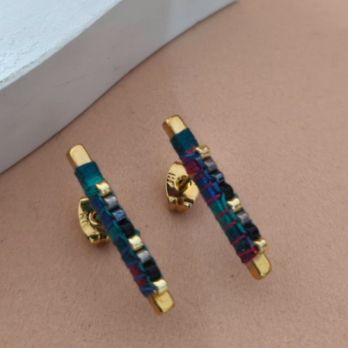 Alloy stud earrings with black beadwork wrapped across slim gold bars. Compact colorful pair with a neat handcrafted finish.