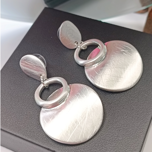 Alloy drop earrings with brushed silver round discs and linked ring details. Lightweight pair with a modern finish.