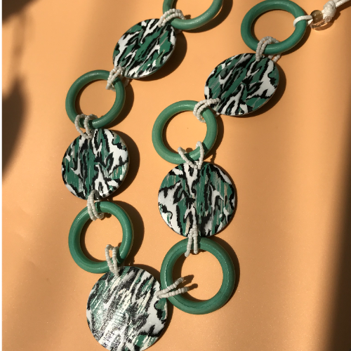 Green patterned discs and ring links on a cord. Bold statement piece with a playful handcrafted look.